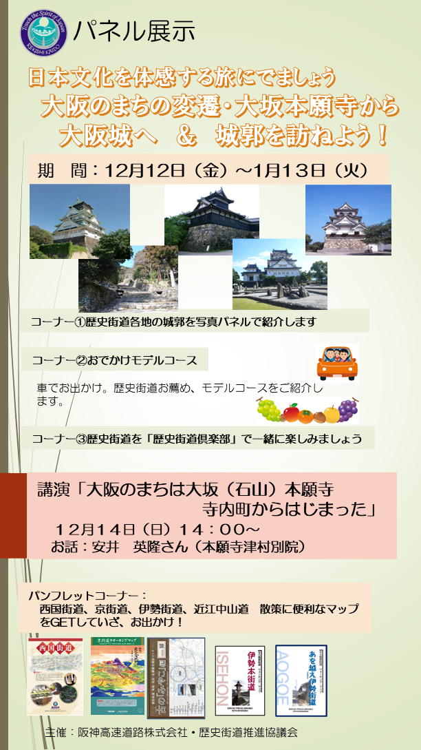 大阪ミナミ・アメリカ村の阪神高速1号環状線の高架下で阪神高速道路株式会社が運営する「阪神高速ミナミ交流プラザLoop A」において、歴史街道推進協議会と阪神高速道路株式会社主催による企画展「日本文化を体感する旅にでましょう~大阪のまちの変遷・大坂本願寺から大阪城へ&城郭を訪ねよう!~」を実施します。