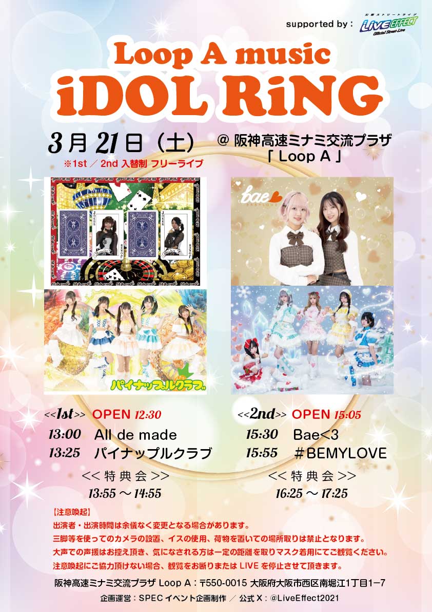 10/11(土)~13(月) ※13(月):iDOL RiNG OPEN=Loop A music:11:15 / iDOL RiNG:10:45 / START=Loop A music:11:30 / iDOL RiNG:11:00